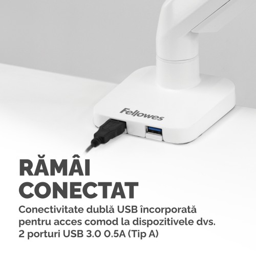 Cele doua porturi USB 3.0 (0,5A) de la baza permit conectarea comoda a propriilor dispozitive, iar sistemul de organizare a cablurilor va pastreaza biroul ordonat.