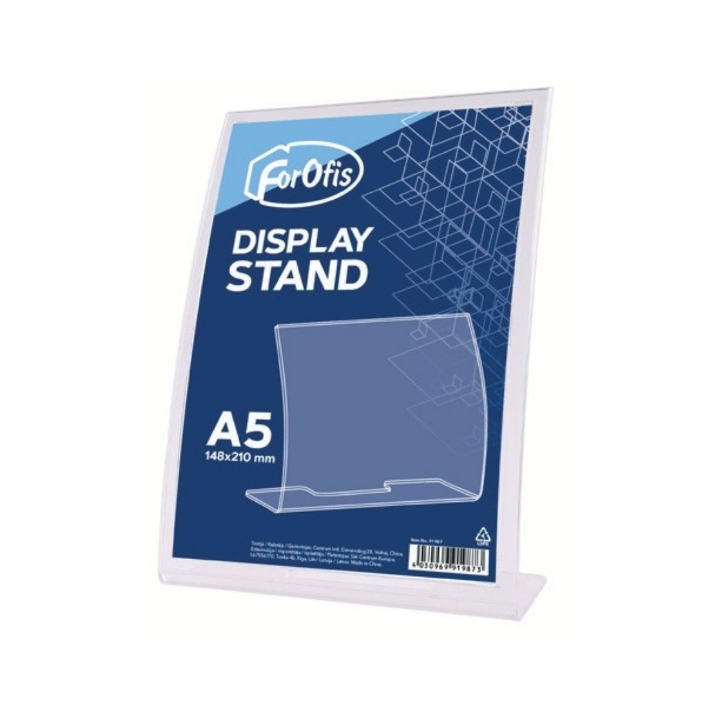 Display de prezentare Forofis, format A5, design curbat in forma de „L”, orientare orizontala (landscape). Ideal pentru expunerea mesajelor si informatiilor intr-un mod elegant si compact. Disponibil in dimensiuni A4 si A5.