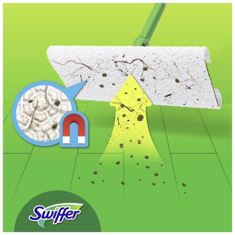 In cele din urma, aveti solutia pentru a matura si spala cu mopul pardoselile cu doar 1 instrument. Trusa de baza Swiffer Sweeper contine deja 8 lavete uscate groase, care capteaza si blocheaza de 3 ori mai multa murdarie, praf si par decat maturile traditionale. Acesta poate fi utilizat pentru a completa aspiratul, captand praful fin ramas, sau ca instrument de curatare intre aspirari, pentru a evita curatenia generala frecventa. Cum? De ce? Grosimea lavetelor si modelul specific, combinate cu actiunea lor electrostatica, permit captarea prafului si blocarea acestuia in laveta. Dar asta nu este tot, dupa ce ati terminat cu praful, este timpul sa curatati.
