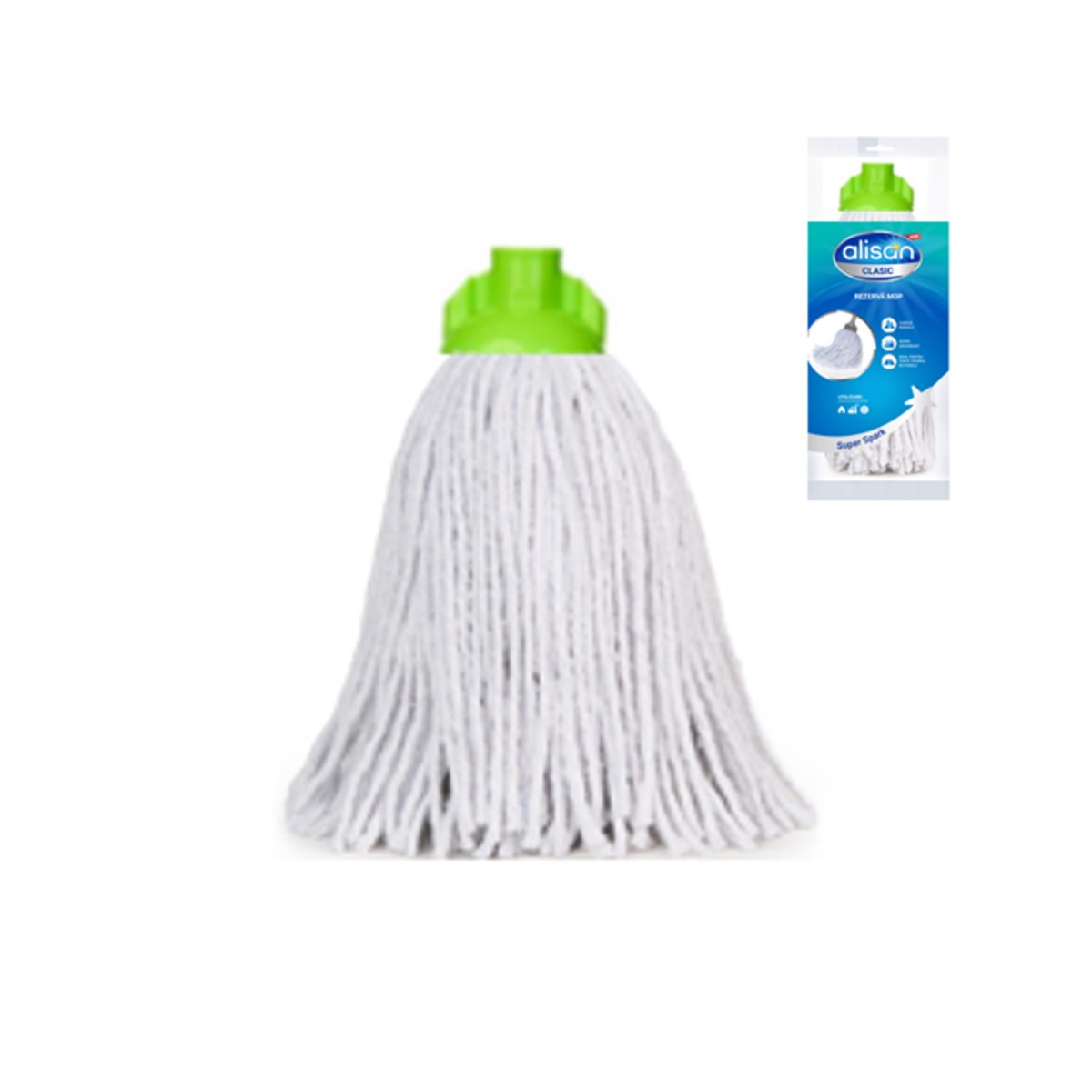 Mop din fire albe de bumbac, rezistent, usor de folosit, ce asigura o absorbtie ridicata. Curata usor, fara sa lase urme, filet conic din plastic ce se adapteaza oricarui tip de maner. Culori disponibile montura mop: Rosu, Verde, Albastru, Portocaliu.