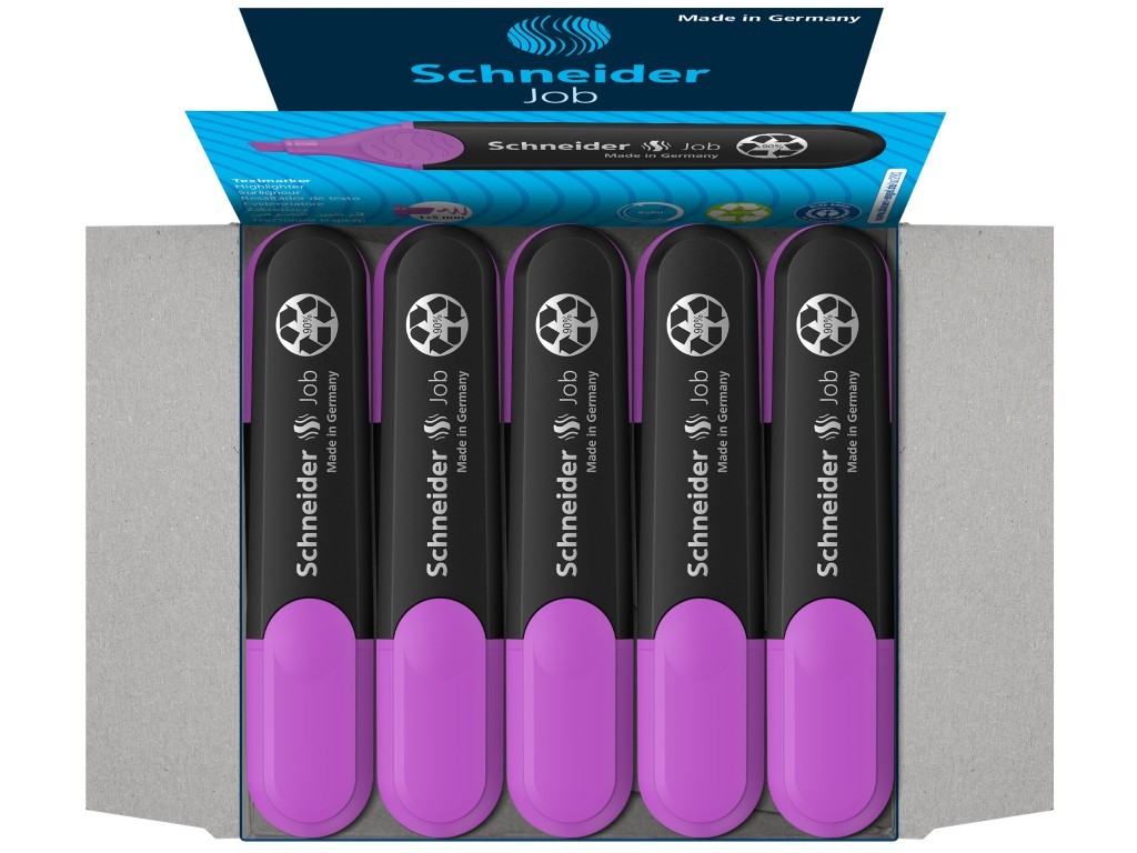 Textmarker Schneider Job pe bază de cerneală cu strălucire maximă și rezistență la lumină pe hârtie standard, de copiator și de fax. Corp din polipropilenă, complet reciclabil. Capacul are clip de prindere.
